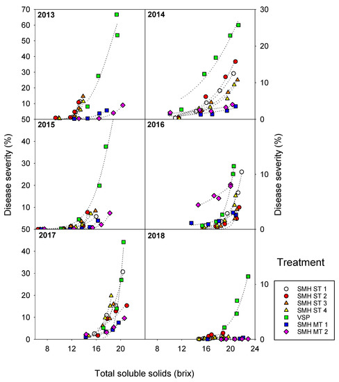 Progress of the disease severity of B. cinerea in the different treatments between 2013 and 2018 as functions of the total soluble solids. Plot symbols represent the observed disease severities, with the lines showing the calculated progress according to the sigmoidal equation type y = 100/(1 + e−((x−x0)/b)). SMPH, semi-minimal pruned hedge; ST, shoot topping; VSP, vertical shoot positioning; MT, mechanical thinning.