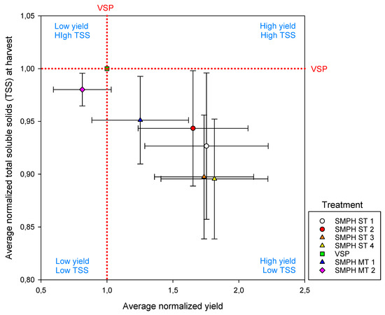 Average normalized yield (ratio of the yield in the different treatments and the yield in the standard treatment, VSP) plotted against the average normalized TSS (ratio of the TSS in the different treatments and the TSS in VSP) at harvest. Data from 2014 to 2018. Error bars = standard errors.