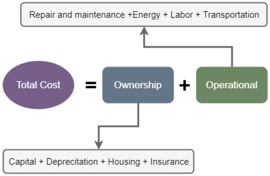 For economic assessment, the operational processes (e.g., crop and soil treatments) within a production system remain identical for both conventional and robotic systems. A schematic presentation of the individual cost elements considered in the determination of the economic model is demonstrated in Figure 1. This cost assessment model applied both for conventional equipment and robotic systems.
