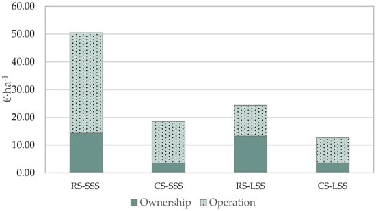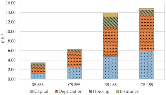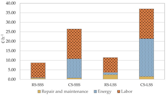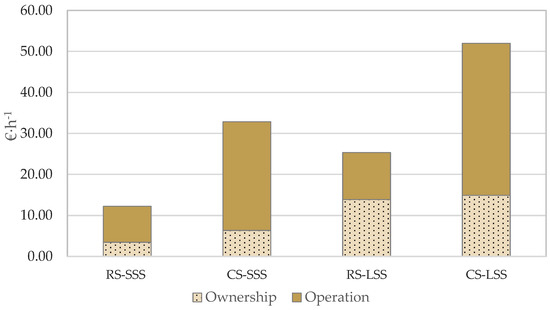 Ownership cost and operation cost contribution to hourly cost (RS—Robotic System; CS—Conventional System; SSS—Small-Scale Scenario; LSS—Large-Scale Scenario).