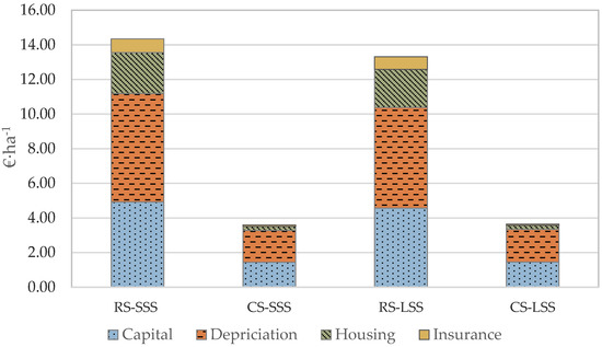 Figures 5–8 present the analysis of the individual ownership and operation cost both per unit area and unit time for the specific operation. As it can be seen in Figure 4, with respect to the unit area cost, the capital and the depreciation cost are the most significant ownership cost elements compared to housing and insurance cost. More specifically, the capital and depreciation cost contribute 78% of the total ownership cost in the case of the robotic system (both in the small and large-scale scenarios). The comparable percentage for the conventional machinery is 91%. This difference is caused by the fact that in the case of the robotic system, the housing and insurance coefficients were assumed to be three times higher compared to the respective conventional ones.