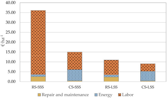 Operation cost per unit area analysis (RS—Robotic System; CS—Conventional System; SSS—Small-Scale Scenario; LSS—Large-Scale Scenario).