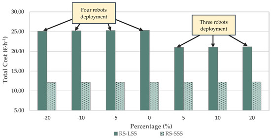 Figure 3 presents the total cost per unit time for both robotic and conventional systems in the case study examined. In the case of the robotic system, the operation cost contributes 45.2% and 71.6% of the total cost per unit time for the large-scale scenario and the small-scale scenario, respectively. The comparable percentages for the conventional system are 71.4% for the large-scale scenario and 80.7% for the small-scale scenario.