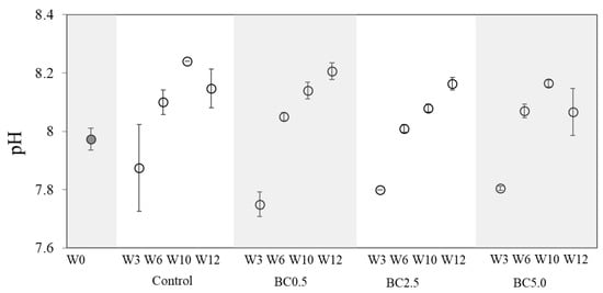 The addition of biochar was supposed to and did change certain physical and chemical characteristics of the soil. Initial soil pH at W0 (prior to experiment setup) was 7.97 ± 0.04. With the addition of highly alkaline biochar, overall soil pH increases were expected. However, some minor decreases in soil pH were observed during the first three weeks of the study (e.g., 1.2% and 2.8% for the control and BC0.5, respectively) as indicated by the first measurement at W3 in all treatments. At later weeks, slow and significant increases were noted for control and BC2.5 treatments (p < 0.016; Figure 1), indicating the influences of changing environmental conditions, such as rainwater or irrigation, and evapotranspiration conditions, rather than biochar additions itself.