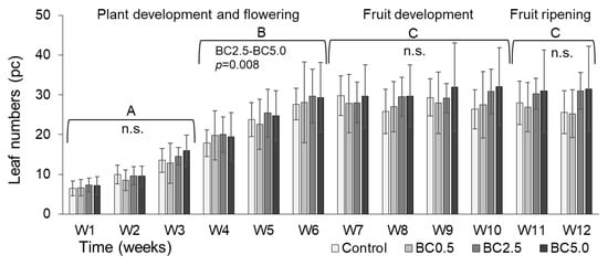 Plant leaf numbers showed no significant differences among treatments in any stage of the development. Plant development took place in a similar way in all treatments as indicated by temporal changes in leaf numbers. When comparing leaf number at different growth stages, we found significant increase during W1–W3 (plant development), which continued from W4 to W6 (flowering), reaching its final maximum by the end of W6, when plant maturity stage started and no further significant change was detected (Figure 2). Plant flowering started to develop around W2, when 1–3 flowers per plants were observed. By W3, more than 50% of the plants were flowering with an average of 1.14 to 1.64 flowers per plant (BC0.5 and BC2.5, respectively; data not shown). In the flowering stage (starting from W3), major differences between treatments were not observed except in W5, where 24.9% (p > 0.05) more flowers were counted in BC5.0 compared to control treatment, indicating primary positive effects of biochar on plant growth. Fruit development phase was reached around W6 of the study, when flower numbers showed no significant differences among treatments (p > 0.05). By W10, all plants were in the full fruit development phase. Even though there were up to 18 flowers per plant during the plants’ growing stage, only 4–5 full fruit developments per plant were observed at the end of the W12 in the present study, which also represents the harvest time.