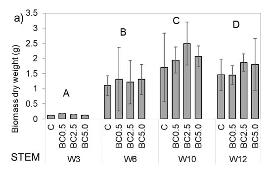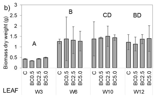Plant biomass varied similarly in all treatments, but some small differences attributed to biochar addition could be detected. Based on temporal changes of stem biomass values, regardless of treatment, all stages were significantly different (p < 0.033) from each other (Figure 3a), indicating a continuous plant development. The apparent decrease in stem biomass by W12 can be an artifact due to the difference in sample number, as, at the end of the experiment, all remaining plants were analyzed instead of using the usual sample size (8 vs. 2 plants per treatment, respectively). Looking at plant parts separately as stem and leaf, we can conclude that the growths of leaves and, consequently their biomass values, showed similar tendencies to that of stems (Figure 3), although both leaf biomass and leaf numbers reached their maxima earlier (W6), the compared stems in all treatments and remained approximately constant afterwards. Maximal stem biomass occurred in W10 in all treatments, when BC2.5 presented the highest stem biomass among treatments; however, the difference among treatments was not statistically significant (Figure 3b). Plant leaf mass showed significant differences from the other growth stages’ values only at W3 (p < 0.001; Figure 3b) in the early stage of plant development, i.e., at W6 BC0.5, while at W10 measurements BC2.5 treatments produced the highest leaf and stem dry weight mass per plant (Figure 3).