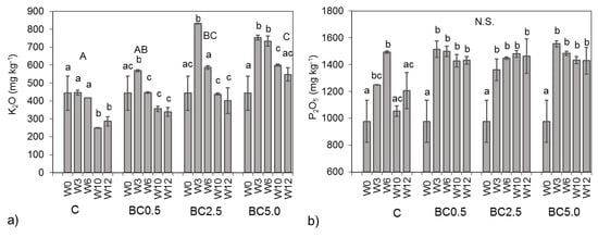 Following the initial increase as a consequence of the added biochar’s K content, the potassium concentrations in the experiment were decreasing over time in all treatments, most notably in the BC2.5 amended soils (>51.8% reduction by the end of the experiment (W12); Figure 4a). The BC0.5 and BC5.0 treatments showed similar overall K reduction rates (35.7% and 27.3%, respectively), indicating that most K decreases were driven by plant growth rates and uptake, and its availability was not limiting. Overall, changes in K contents between treatments resulted in significant differences among treatments in some cases, such as between control (C) and BC2.5, or between BC5.0 and both control (C) and BC0.5 (Figure 4a).