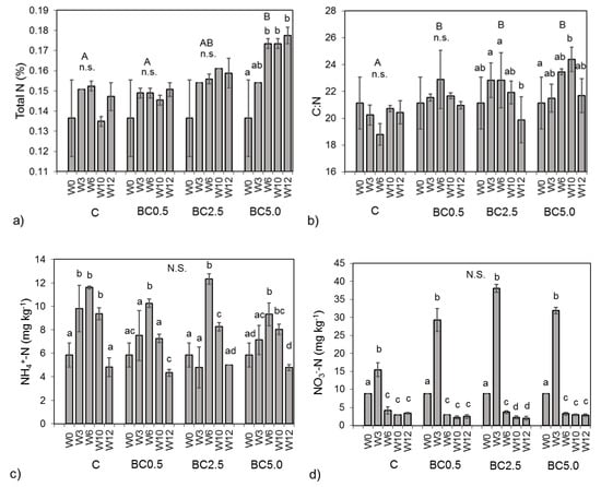 Figure 5. Soil nitrogen as (a) total N, (b) C:N ratio, (c) NH4+-N, and (d) NO3-N, changes over the course of study. Error bars represent standard deviations between three replicates per treatment. Statistically significant differences (p < 0.05) are indicated by different letters, while N.S. denotes not significant differences between treatments.