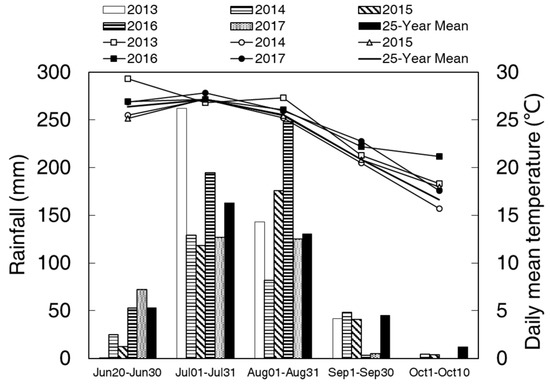 Field experiments were conducted from 2013 to 2017, in the summer maize growing seasons, at Wuqiao Experimental Station of China Agricultural University (37°41′ N, 116°37′ E) at Cangzhou, Hebei Province, China. Winter wheat (early-October to early-June) and summer maize (mid-June to early-October) rotation is the main crop rotation system in this region. The climate is temperate semi-arid monsoon with a mean annual temperature of 12.9 °C and precipitation of 562 mm (last 25 years average) which mainly occurred between July and August. The monthly rainfall and mean temperature for the five maize growing seasons and the 25-year average are shown in Figure 1, and the weather condition every ten days is shown in Table S1. The field soil is sandy clay loam with pH 8.6, 14.4 g kg−1 organic matter, 0.81 g kg−1 total N, 0.14 g kg−1 available K and 32.5 mg kg−1 available P at the top 20 cm soil layer.