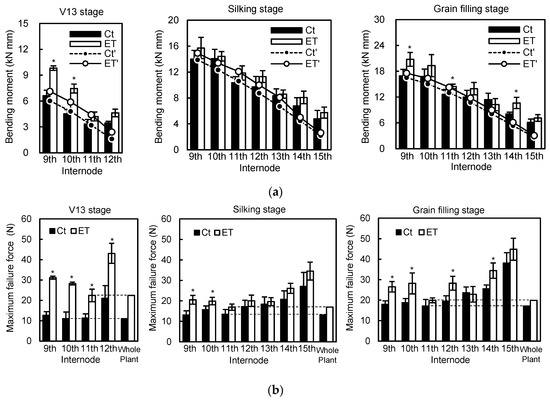 Effects of ethephon (ET) on stalk bending properties. (a) Effects of ethephon on the maximum bending moment (Mmax, the black and white bar for the control (Ct) and ET, respectively) and actual bending moment (M’, solid and dotted line for Ct’ and ET’, respectively) in each basal internode at V13, silking and grain filling stage. (b) Effects of ethephon on maximum failure force (Fmax) of each internode and whole plant at V13, silking and grain filling stages. Fmax indicated maximum failure force of each internode and whole plant when exerting force at the ear node of the plant (at the 13th node at the V13 stage). Values with error bar were the mean ± SD (n = 6). The asterisk means the significant difference between ET and Ct in the same internode.