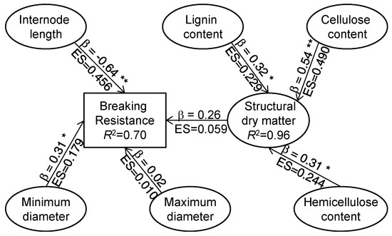 Hypothetical structural equation model (SEM) to describe the direct relationships among changes of morphological and chemical traits and internode breaking resistance with ethephon. R2 is the coefficient of determination indicating the variability explained for each dependent variable. β-values indicated the path coefficients. The level of significance are indicated by * (p < 0.05), ** (p < 0.01) and *** (p < 0.001). The ES is the effect size indicated by the path coefficient (β-value) as < 0.02 (too week), 0.02 (small effect), 0.15 (medium effect) and 0.35 (large effect).
