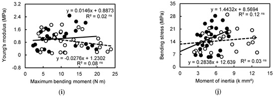 Pearson’s correlation of the maximum bending moment with internode maximum diameter (a), minimum diameter (b), internode length (c), moment of inertia (d), bending stress(e), flexibility (f), maximum failure force when load at the ear node (g), penetration resistance strength (h) and Young’s modulus (i), and the relationship between maximum bending stress and moment of inertia (j). Solid round represented Ct (control); hollow round represented ET (ethephon treatment). The solid line and dash line are regression line of Ct and ET respectively. ns, no significance, *, p < 0.05, **, p < 0.01, ***, p < 0.001.