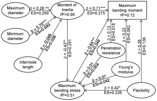 In addition, a path analysis was conducted using the relative change ratio of mechanical properties under ethephon treatment ((ET-Ct)/Ct). The global model fitness and quality index suggested good fitness of this model (Table S4). The influence of mechanical properties described above explained 72 % and 51% of the variability in the maximum bending moment and bending stress respectively in this model. The moment of inertia and maximum bending stress had significant path coefficients of 0.71 (p < 0.001) and 0.64 (p < 0.001) to maximum bending moment and effect size of 0.275 and 0.349, respectively (Figure 6 and Table S4). However, the penetration resistance and Young’s modulus had not significant β-values of 0.13 and 0.22, respectively. Meanwhile, the moment of inertia had negative path coefficients of −0.43 (p = 0.004) and medium effect of 0.251 to maximum bending stress. Also, flexibility had a significant path coefficient of 0.42 (p = 0.049) to maximum bending stress, but not a significant path coefficient of 0.26 (p = 0.064) to maximum bending moment. Moreover, 99% of the variability in moment of inertia was explained under the influence of internode diameters and length, among which the minimum diameter had significant primary contribution with a path coefficient of 0.70 and effect size of 0.693.