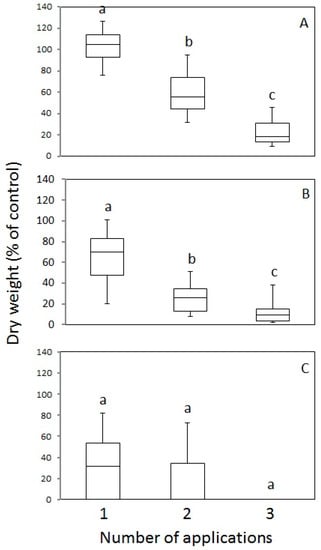 The impact of sequential flaming applications on the dry weight (% of control) of Sorghum halepense (A), Cyperus rotundus (B) and Ecballium elaterium (C). Different letters indicate significant differences, as determined by Tukey LSD test (p ≤ 0.05). Values are means ± SD (n = 7).