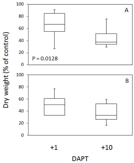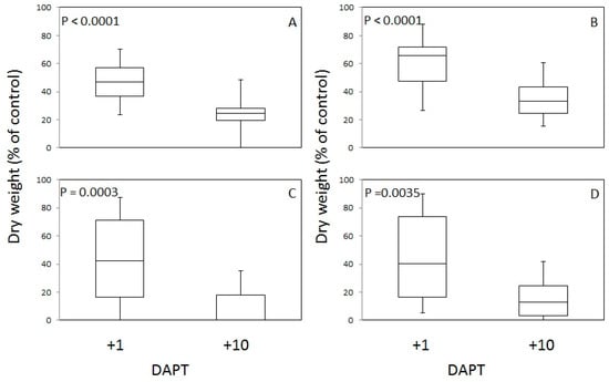The impact of third treatment timing (1 or 10 days after previous treatment (DAPT)) on the above-ground dry weight (A) and root dry weight (B) (% of control) of Cyperus rotundus. p-values were determined by Student’s t-test. Values are mean ± SE (n = 7).