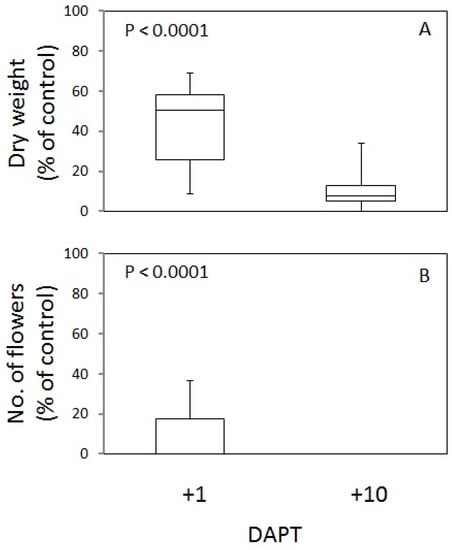 The impact of second treatment timing (1 or 10 days after previous treatment (DAPT)) on the above-ground dry weight (A) and the number of flowers (B) (% of control) of Ecballium elaterium. p-values were determined by Student’s t-test. Values are mean ± SE (n = 7).
