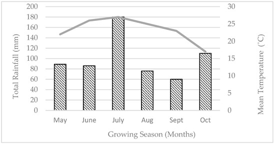 The field trial was conducted in 2015 at Tennessee State University (TSU) Certified Organic Farm (latitude 36°19′ N and longitude 86°49′ W) in Nashville, TN. The mean monthly temperatures for the growing season (Figure 1) ranged from 17 °C to 27 °C. Total monthly rainfall (precipitation) ranged from 74mm to 180 mm. Over the entire cultivation period, the average temperature was 23 °C (Figure 1). Average precipitation was 100mm. Prior to planting, our organic soil samples collected from the farm (n = 4) were sent for analysis conducted by the National Soil Project, Department of Chemistry and Chemical biology, Northeastern University Boston, MA. On analysis as percent (w/w) on a dry sample basis, the value ranges were as follows: humic acid (HA) from 1.8 to 4.6%, fulvic acid (FA) from 0.19 to 0.28%, retained water (soil moisture) from 0.6 to 5.4%, humification from 55 to 66%, and total soil organic matter (SOM) was from 3.8 to 7.8.
