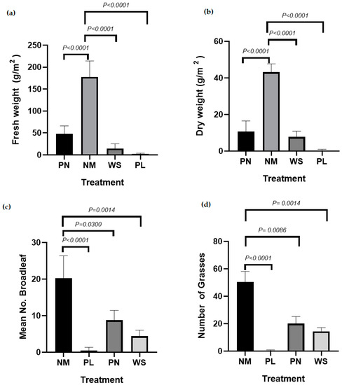 The Tukey’s HSD post-hoc test showed that the control (no mulch) treatment (Figure 2a,b) had the highest fresh and dry weight of weeds and it was significantly different from all the mulch treatments. The no mulch (NM) treatment had the highest density of broadleaves and grasses (Figure 2c,d).