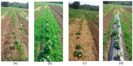Below are pictures of mulch treatment in a sweetpotato field (Figure 3a–d).