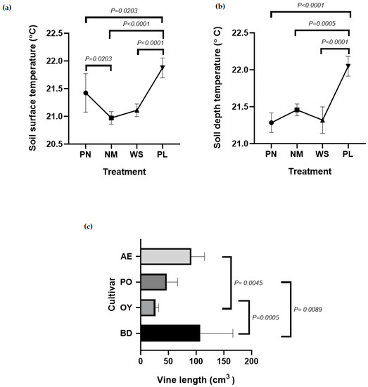 Soil temperature was influenced various mulch treatments (No mulch (NM), Black Plastic Mulch (PL), Pine Needle Mulch (PN) and Wheat Straw Mulch (WS) and cultivars (Beauregard (BD), O’ Henry (OY), Porto Rico (PO) and All Purple (AE)) varied in vine length (a) Soil surface temperatures in various mulch treatments, (b) Soil depth temperatures below the various mulches, (c) Vine lengths of different sweetpotato cultivars.