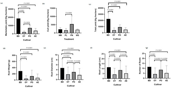 Root diameter, length, and number in sweetpotato cultivars: Beauregard (BD), O’ Henry (OY), Porto Rico (PO) and All Purple (AE) in various mulch treatments: No mulch (NM), Black Plastic Mulch (PL), Pine Needle Mulch (PN) and Wheat Straw Mulch (WS). (a) Marketable yields amongst sweetpotato cultivars, (b) Cull yields in various mulch treatments, (c) Total yields amongst sweetpotato cultivars, (d) Root weight for each sweetpotato tuber, (e) Root length of each sweetpotato tuber, (f) Root diameter of each sweetpotato tuber (g) Number of Sweetpotato roots.