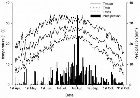 Average daily temperature and precipitation for the period 2012–2017. Note: Tmean: daily mean temperature; Tmin: daily minimum temperature; Tmax: daily maximum temperature.