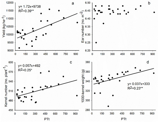 Maize yield was positively correlated with the pre-thermal time (PTt) (r = 0.62**) (Figure 2). The yield stabilized at greater than 10,500 kg ha−1 when the maize was sown above 479 °C. The trends of kernel number and 1000-kernel weight were basically consistent with yield, and kernel number and 1000-kernel weight were positively correlated with the PTt (r = 0.71** and r = 0.58*, respectively). No association was found between ear number and PTt, but ear number was basically stable at approximately 6.45 m−2.
