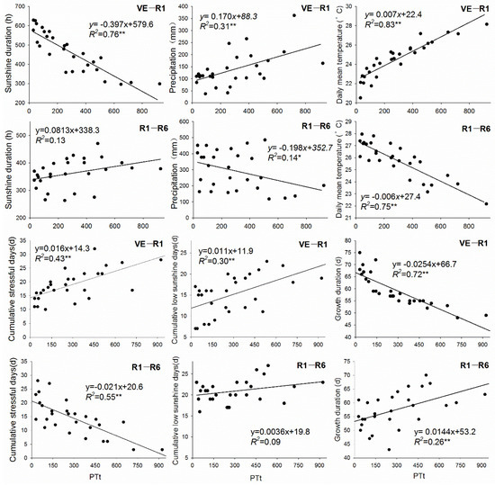 The sunshine duration from emergence to silking (VE–R1) decreased (r = 0.87**) with the postponement of the sowing date and was not related to the sowing date from silking to maturity (R1–R6) (Figure 3). The precipitation of VE–R1 increased (r = 0.55**) with delaying planting, but decreased (r = 0.38*) during R1-R6. The daily mean temperature (Tmean) of VE–R1 increased (r = 0.91**) with later planting, but decreased (r = 0.86**) during R1–R6. The growth period of VE–R1 linearly decreased with the delay of sowing date, while the growth period of R1-R6 showed the opposite trend (r = 0.51**). From the regression equation, the Tmean of R1–R6 was less than 24.5 °C when maize was sown after PTt 479 °C, but the growth period was more than 60 days.