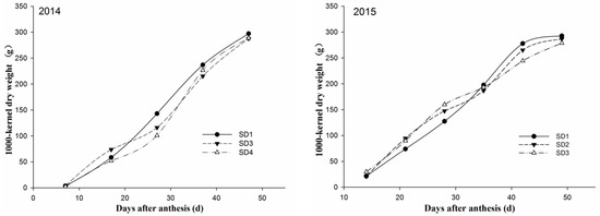 One-thousand-kernel dry weight dynamics of the middle kernels from maize planted in 2014, 2015, and 2017. The three sowing dates of 2014 are SD1 (9 Apr.), SD3 (5 May) and SD4 (25 May). The three sowing dates of 2015 are SD1 (5 Apr.), SD3 (5 May) and SD4 (27 May). The six sowing dates of 2017 are SD1 (6 Apr.), SD2 (21 Apr.), SD3 (5 May), SD4 (21 May), SD5 (4 Jun.) and SD6 (21 Jun.).