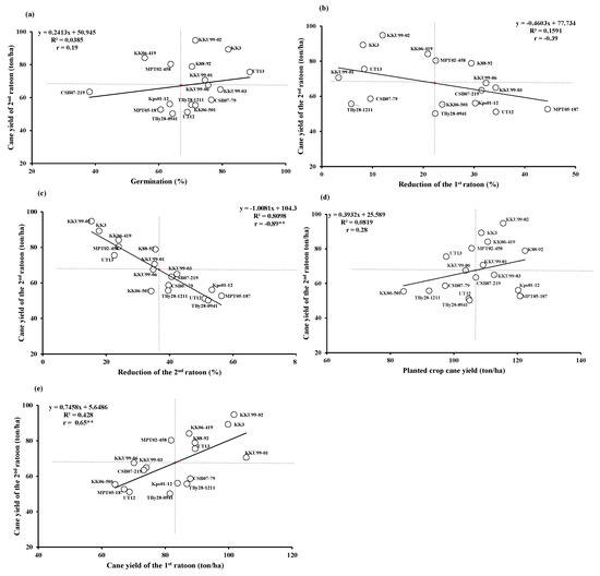 Correlations coefficients between: (a) cane yield and germination percentage of the 2nd ratoon crop in 2016; (b) cane yield of the 2nd ratoon crop and reduction percentage of the 1st ratoon crop in 2015; (c) cane yield of the 2nd ratoon crop and reduction percentage of the 2nd ratoon crop; (d) cane yield of the 2nd ratoon crop and cane yield of the plant crop in 2014; and (e) cane yield of the 2nd ratoon crop and cane yield of the 1st ratoon crop of the 17 sugarcane genotypes.