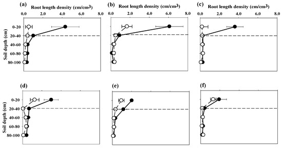 Distribution patterns for the root length density of 17 sugarcane genotypes in five soil layers at 20 cm intervals, resulting in an upper soil layer (0–40 cm) and a lower soil layer (40–100 cm), evaluated at two positions—between plants (BP, ●) and between rows (BR, o)—at 90 days after harvest in 2016. Genotype groups were comprised of: (a) TBy28-1211, K88-92, KKU99-03, TBy28-0941, KK06-501, UT12, and KKU99-06; (b) KK3, Kps01-12, and UT13; (c) CSB07-79, CSB07-219, and MPT02-458; (d) KKU99-01; (e) KK06-419 and KKU99-02; and (f) MPT05-187.