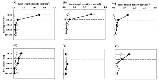 Root samples of each layer were washed manually with tap water to remove soil from the roots. The root samples were then analyzed via the Winrhizo program (Winrhizo Pro (s) V. 2004a, Regent Instruments, Inc., Quebec, Canada) to determine root length. RLD was calculated as the ratio between root length (cm) and soil volume (cm3). RLD from the first (0–20 cm) and second (20–40 cm) layers were combined and defined as the upper soil layer (0–40 cm), while the RLD for the deeper layers (third to fifth) were combined to form the lower soil layer (40–100 cm).