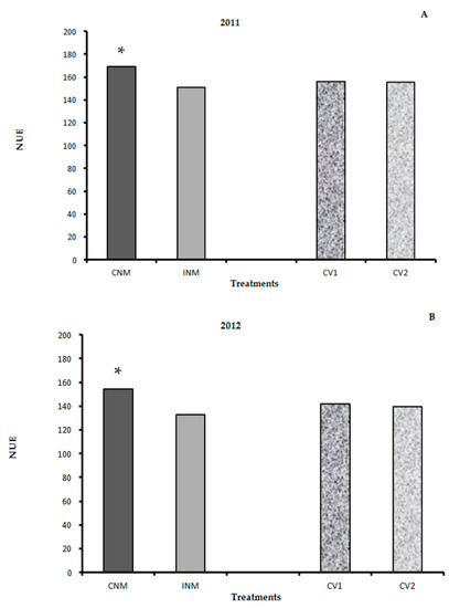 Figure 1 shows that in both years the N utilization efficiency (NUE) value was highest in CNM (on average 162) compared to INM (on average 142); no significant difference was found between the CVs.
