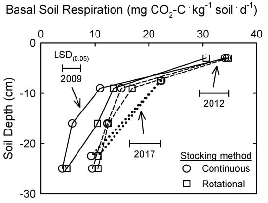 Basal soil respiration as affected by stocking method, soil depth, and year of sampling. Least significant difference (p < 0.05) is among all means within a year of sampling.