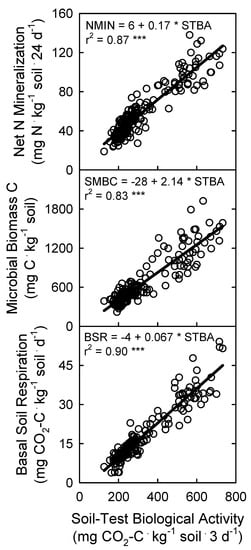 Association of soil-test biological activity to other indicators of soil biology, including basal soil respiration, soil microbial biomass C, and net N mineralization during aerobic incubation. *** indicates significance of association at p < 0.001.