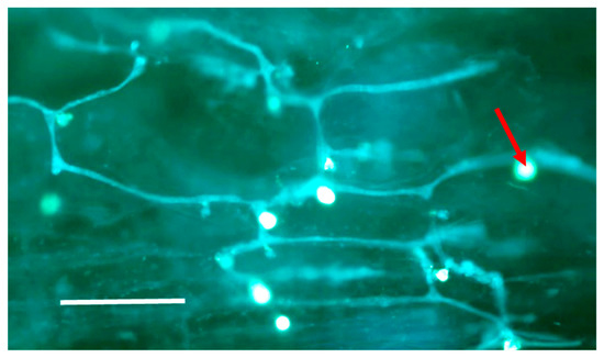 Stem internodes were excised from the inoculated plants and processed as described before [19]. Briefly, stem internodes (1 cm long) were sectioned longitudinally with a razor blade into thin (about 0.5 mm) slices. They were clarified in boiling ethanol, placed in aniline blue solution (0.05% aniline blue in 0.05 M K2HPO4, pH 8.9) at 4 °C for 24 h, stained with 0.01% calcofluor (Sigma) and examined with an Olympus A70 epi-fluorescent microscope. Fungal structures inside the stem showed green-yellow fluorescence. To observe the pathogen on seeds, untreated seeds were placed (5 seeds per group, 10 groups per seed batch) on a glass slide, 20 µL sterile water were added per group, and seeds were to covered with a glass cover slip. Seeds were examined at 30 min after preparation with a dissecting microscope at ×400 magnification.