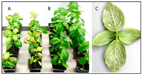 The effect of systemic infection with P. belbahrii on growth of basil plants. (A)—Systemically infected plants that were inoculated at the 4-leaf stage remained stunted. (B)—Healthy, water-inoculated control plants. (C)—Sporulation of P. belbahrii on the lower leaf surfaces of top leaves taken from a systemically infected plant shown in (A). The photos were taken at two weeks after inoculation.