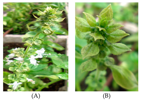 The appearance of downy mildew in flowering basil plants in the field. Seeds were harvested from such plants to examine seed infection and transmission of P. belbahrii. (A)—A flowering basil plant infected with downy mildew. (B)—A close-up photo of the apex, showing heavy sporulation of P. belbahrii.