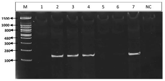 Detection of P. belbahrii in contaminated basil seeds. M—Molecular markers (100–1500 bp). Lanes 1–8: PCR amplification products obtained from: Lane 1—Seeds from healthy plants (Peri) harvested in 2012. Lane 2—Seeds from infected plants (Peri) harvested in 2012. Lane 3—Seeds from infected plants (Sweet Basil) harvested in 2016. Lane 4—Seeds from infected plants (Sweet Basil) harvested in 2017. Lane 5—Seeds from healthy plants (Sweet Basil) harvested in 2016. Lane 6- Seeds from healthy plants (Sweet Basil) harvested in 2017. Lane 7—Positive control, PCR amplification product (134 bp, arrow) obtained from sporangia of P. belbahrii. NC—negative control, water.