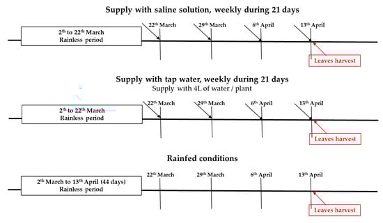 At blooming stage, three different water treatments were applied during three weeks until flowering stage which took place in April 2016, (i) Salt stress where rosemary plants were irrigated with saline solution of 4.2 g of NaCl/L [15], which represented an osmotic pressure of 0.34 MPa and, the saline solution was used by foliar application and by root absorption. (ii) Water stress where rosemary plants were water deprived for 21 days.