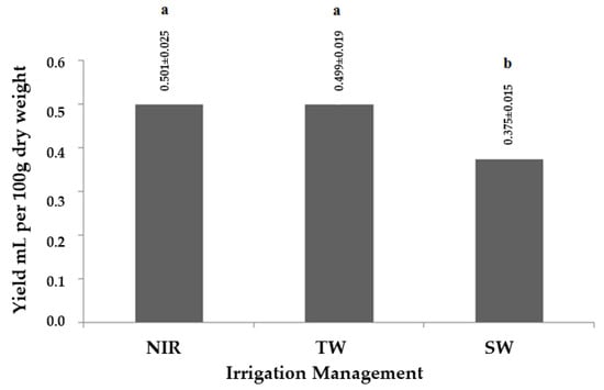 Variation of essential oil yields according to the three applied irrigagtion management. (SW: irrigated with salt water; NIR: not irrigated; TW: irrigated with tap water).