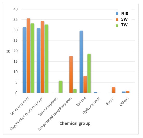 In terms of the affiliation of the essential oil compounds to the chemical groups, results showed that monoterpenes (31.41–35.57%), oxygenated monoterpenes (31.04–34.45%) and ketones group (8.08–29.71%) dominated the oil from all regimes. The ketones group (29.717%) was highest in the rosemary oil plants subjected to NIR regime and lowest in oil plants from TW regime. Esters group (2.845%) distinguished the rosemary oil plants subjected to TW regime. The oil of rosemary plants subjected to SW regime, was differentiated from NIR and TW regimes by the presence of hydrocarbon sesquiterpenes (5.800%) and oxygeneted sesquiterpenes (1.739%) (Figure 3).