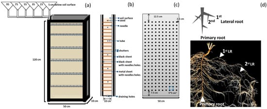 Figure 1. Diagrammatic representation and dimension of rhizobox with six tubes of irrigation (a), cross section showing the different elements of the system (b), spacing of needle at backside of rhizoboxes (c) and taproot system of a rhizobox-grown peanut (d).