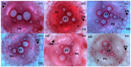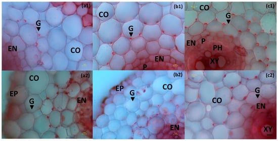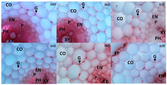 Figure 3. Freehand cross sections of first-order lateral roots under well-irrigated conditions (a1, b1 and c1) and drought stress conditions (a2, b2 and c2) at 21, 28 and 35 days after plant emergence (DAE). CO, cortex; EN, endodermis; G, phi-thickening or cell wall ingrowth; P, pericycle; PH, phloem; XY, xylem; Scale bar = 10 µm; 40×.