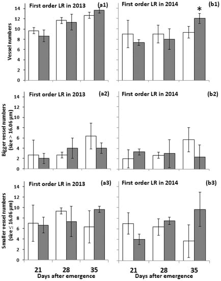 Combined analysis of variance for total vessel numbers, bigger vessel numbers, smaller vessel number, total vessel diameter (µm), bigger vessel diameter (µm), smaller vessel diameter (µm), total vessel area (µm2), bigger vessel area (µm2), smaller vessel area (µm2) of the second order lateral root in 2013 and 2014 are shown in Table 2. Differences in duration (D) and treatment (T) were significant (p ≤ 0.01 and p ≤ 0.05) for most traits. Season (S) was significant for total vessel numbers and bigger vessel numbers. The interactions between duration × treatment (D × T) and duration × season (D × S) were also significant for some traits.