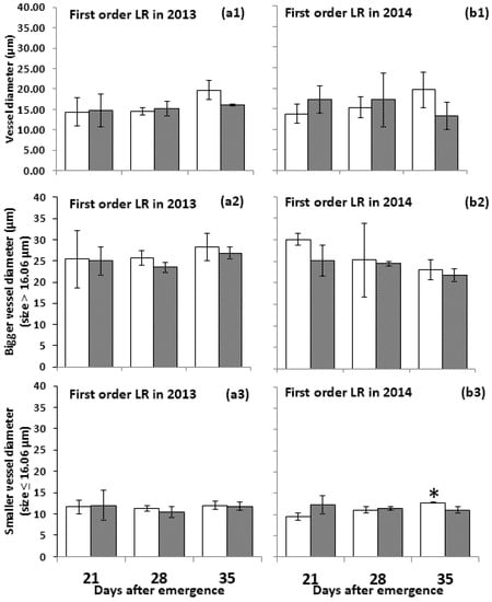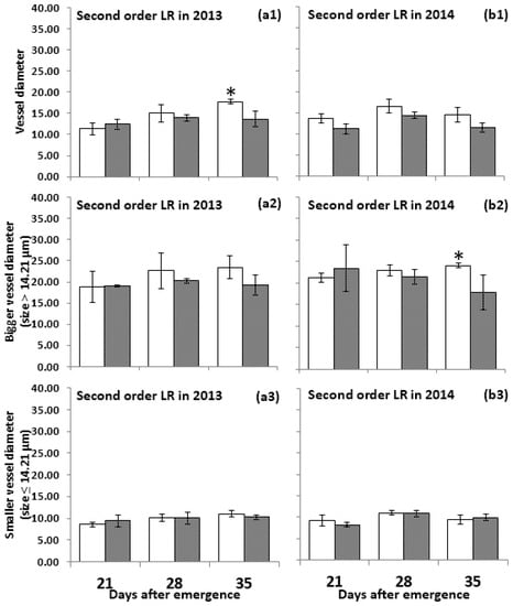 Figure 10. Vessel diameter of second order lateral roots (a1, b1), bigger vessel diameter (a2, b2) and smaller vessel diameter (a3, b3) of peanut at 21, 28 and 35 DAE in 2013 (a) and in 2014 (b); Significant at * p ≤ 0.05, non-stress treatments (□) and stress treatments (■).