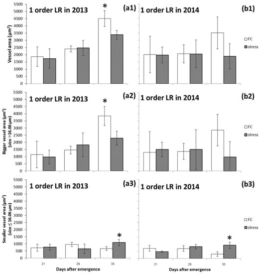 Because stress treatment reduced the diameters of the average xylem vessels and bigger xylem vessels, the area of vessels per cross section of each season and the area of bigger vessels in 2014 was reduced at 35 DAE, although the reduction was not significant and the area of bigger vessels area was significantly reduced at 35 DAE in 2013 (Figure 11). The area of smaller xylem vessels per cross section under stress treatment was increased.