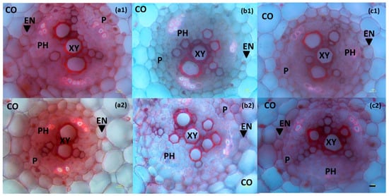 Figure 2. Freehand cross sections of first order lateral roots of peanut under well-irrigated conditions (a1, b1 and c1) and drought stress conditions (a2, b2 and c2) at 21, 28 and 35 DAE, respectively. CO, cortex; EN, endodermis; P, pericycle; PH, phloem; XY, xylem; Scale bar = 10 µm; 40×.