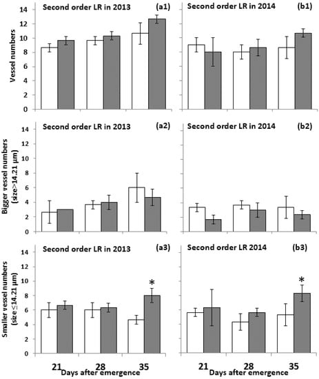 Means for the vessel diameter of second-order lateral roots (Figure 10) of all treatments varied between 4.29 to 38.48 µm (data not shown). Stress treatment significantly reduced the vessel diameter of second-order lateral roots at 35 DAE with drought imposition for 21 days in 2013 and slightly reduced the vessel diameter of second-order lateral roots at 35 DAE with drought imposition for 21 days in 2014. Stress treatment significantly reduced the diameter of bigger xylem vessels in 2014 at 35 DAE with drought imposition for 21 days and stress treatment also reduced the diameter of bigger xylem vessels in 2013, although the reduction was not significant. Stress treatment did not significantly affect the diameter of smaller xylem vessel diameter in 2013 and 2014.