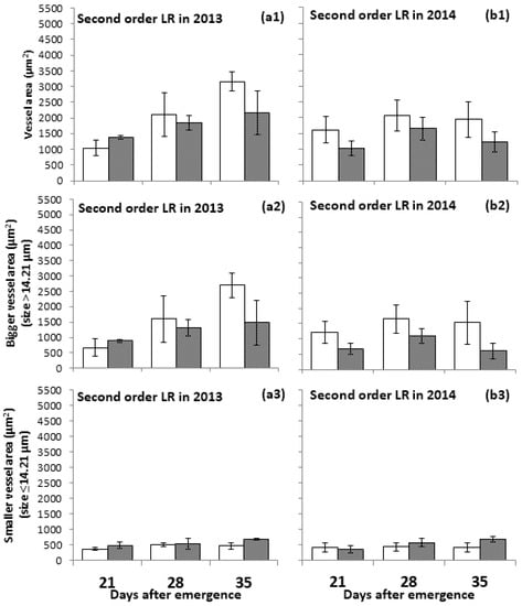 In both seasons, the mean xylem vessel diameters of first order lateral roots was higher than that of the second order lateral roots. The reduction in vessel diameter of first order lateral roots was higher than that of the second order lateral roots and these results may explain the differential root functions. The reduction in vessel diameter of first order lateral roots will better support the transport system’s hydraulic conductivity according to Poiseuille’s law [21]. In hot pepper, drought stress significantly reduced the diameters of xylem vessels in all of cultivars [8]. Vessel diameter is closely and positively correlated with volume of water flow and therefore it is correlated with the ′safety′ of the conductive system [22,23]. The large vessel size under water deficit resulted in xylem cavitation [24]. The narrower diameter of metaxylem vessels maintain the water column, lowers the risk of cavitation, increases water flow resistance and saves water columns in narrower capillaries from damage [25]. Formation of narrower vessels occurring in drought-tolerant dicotyledons (including short-lived perennials and annuals with secondary structure) will likewise be advantageous when the plants are grown under drought [26,27].